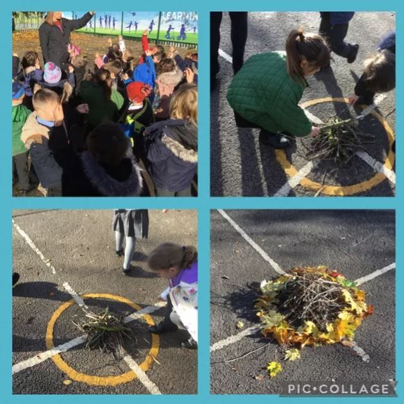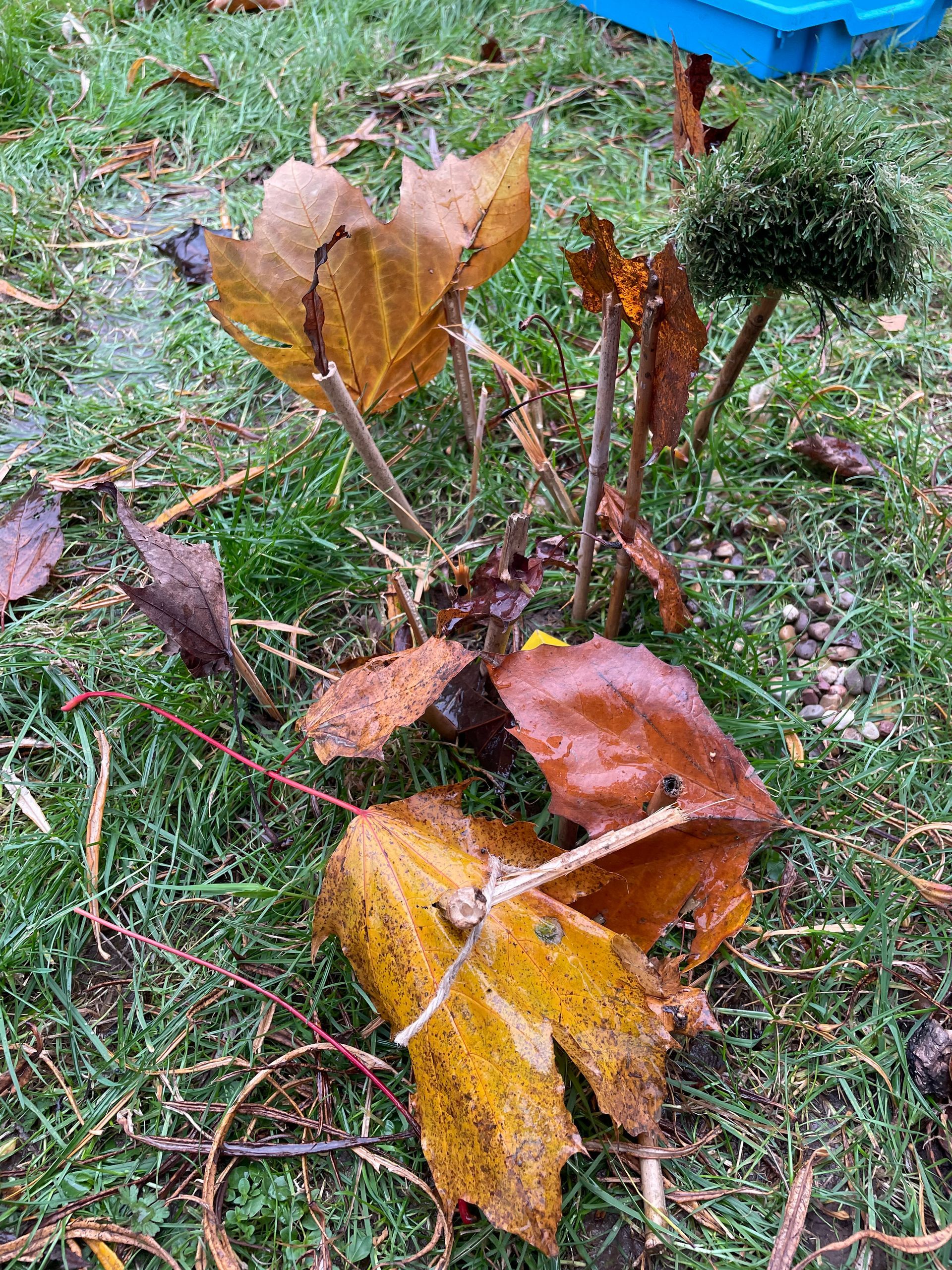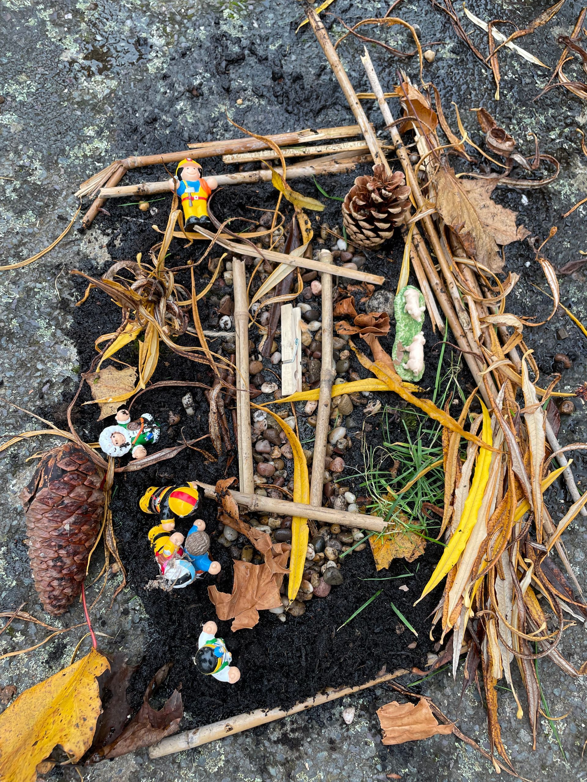 We met a leaf creature who told us he had some very unhappy leaf friends. We worked in groups to make a home for his friends. We also thought about what his friends might need and made it out of natural materials. We noticed how it was much better if we worked together so that we could get more done in the time.