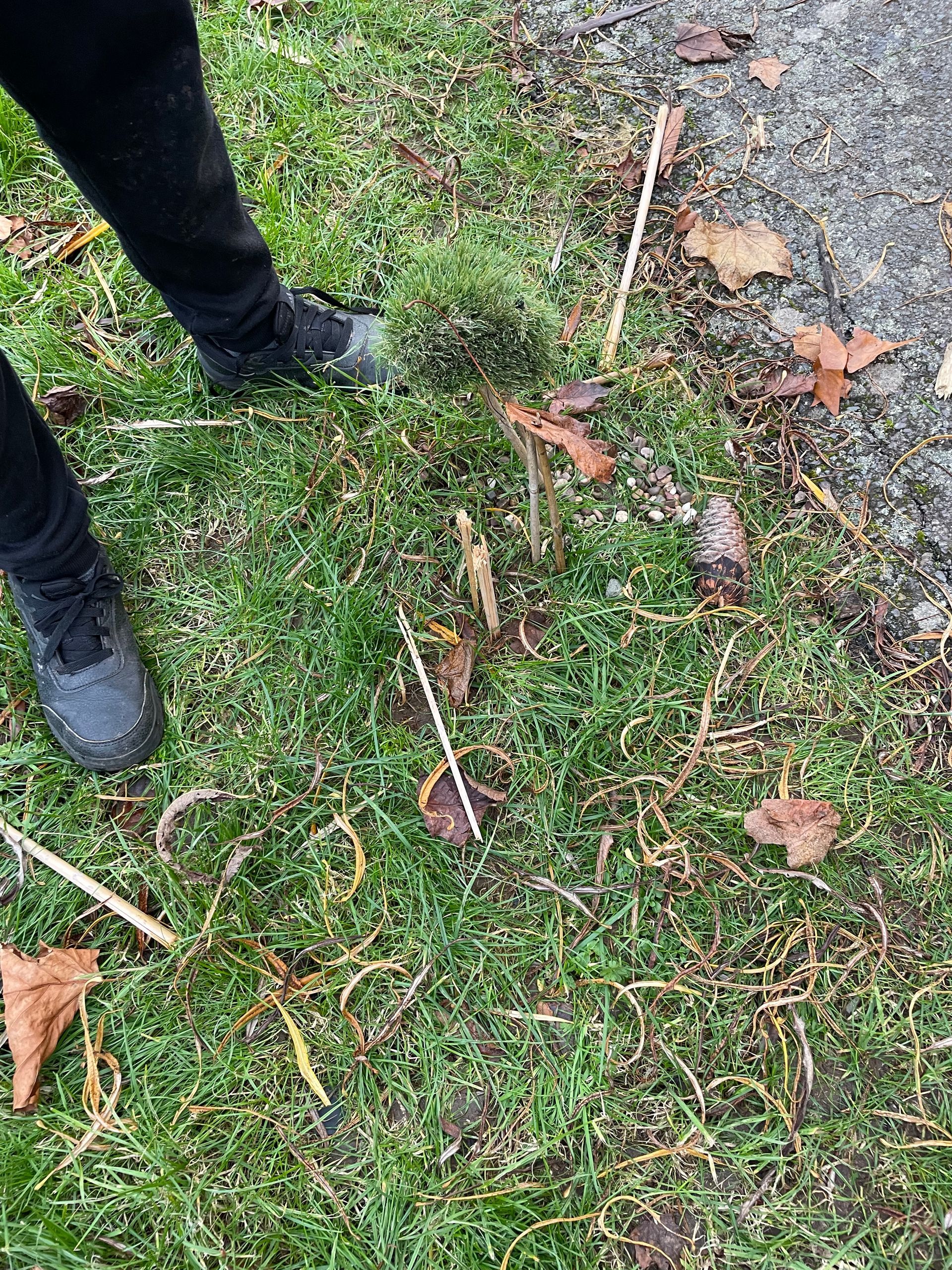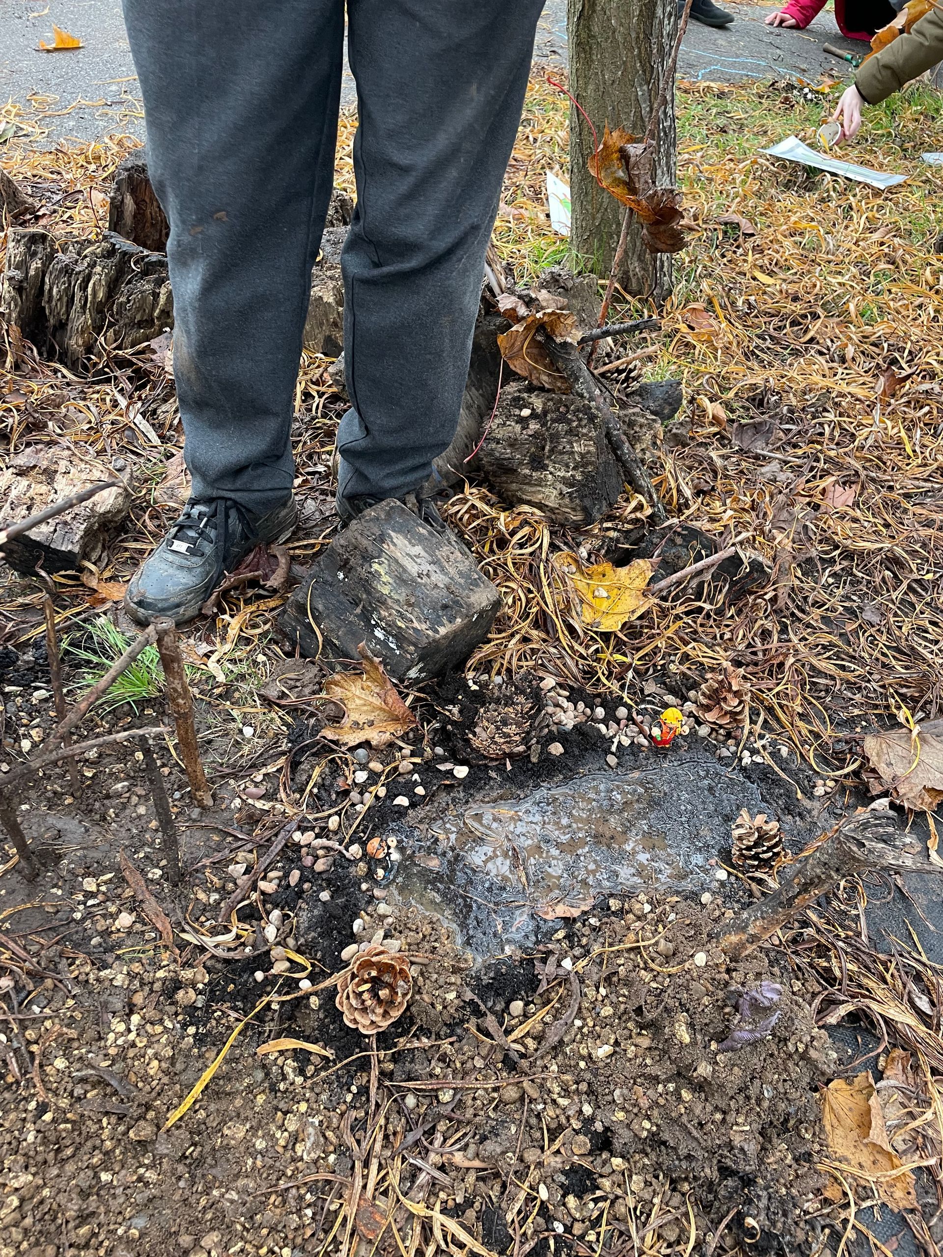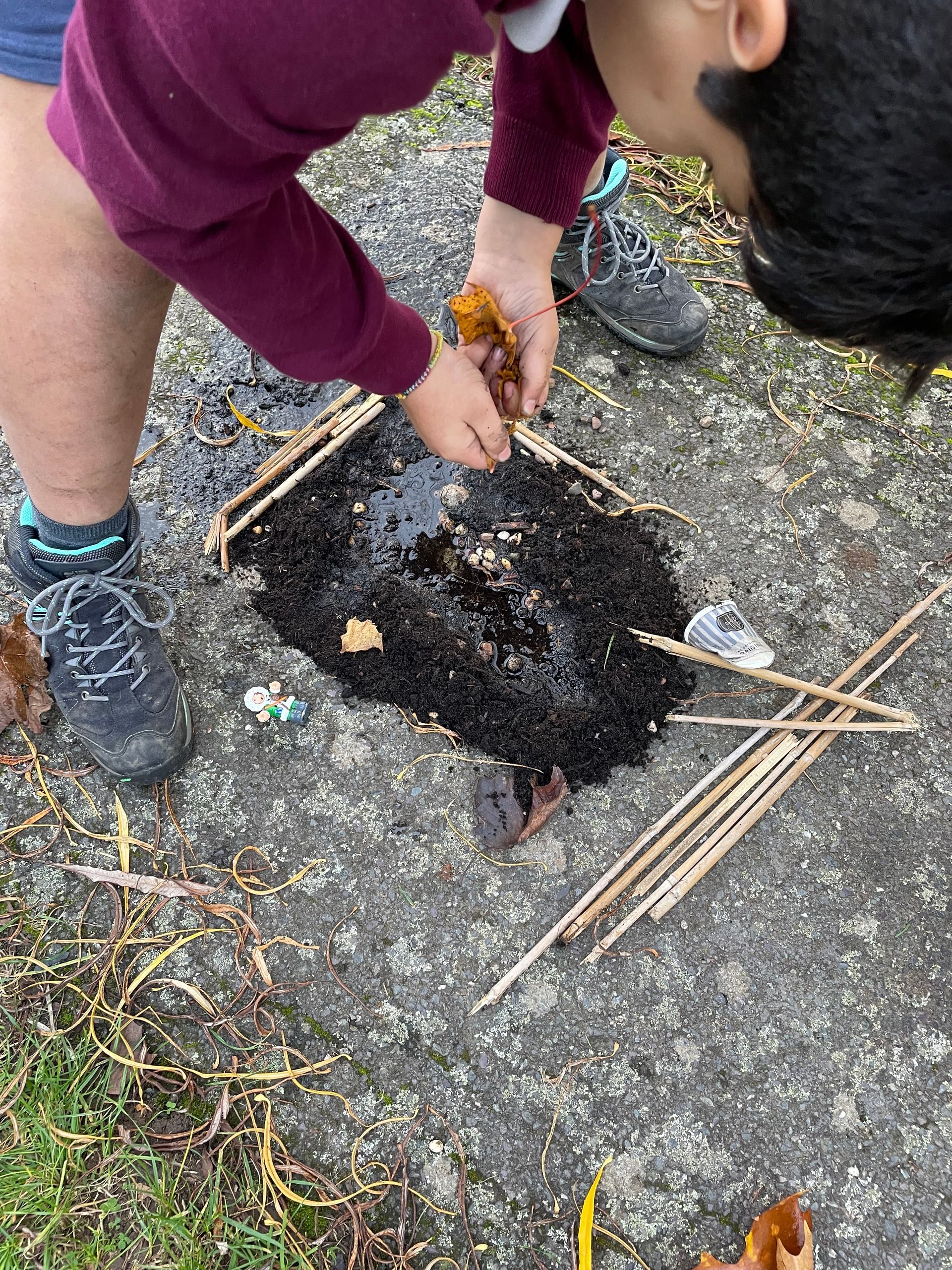 We met a leaf creature who told us he had some very unhappy leaf friends. We worked in groups to make a home for his friends. We also thought about what his friends might need and made it out of natural materials. We noticed how it was much better if we worked together so that we could get more done in the time.